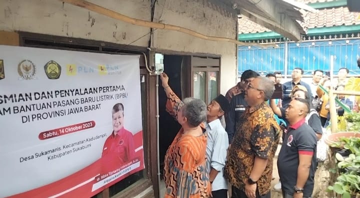 Reportika.co.id || Sukabumi, Jabar – Kementerian Energi dan Sumber Daya Mineral (ESDM) bersama Anggota DPR RI dr. Ribka Tjiptaning yang disaksikan Bupati Sukabumi H. Marwan Hamami melakukan Peresmian Dan Penyalaan Pertama Program Bantuan Pasang Baru Listrik ( BPBL) Provinsi Jawa Barat tahun 2023. Kepada 107 rumah tangga kurang mampu di 4 kedusunan Program (BPBL) Desa Sukamanis Kecamatan Kadudampit, Kabupaten Sukabumi. Sabtu, 14/10/23.