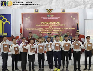 Upacara penyerahan remisi dilaksanakan di Aula Sahardjo Rutan Kelas I Medan Dihadiri langsung oleh Kepala Kantor Wilayah (Kakanwil) Kemenkumham Sumut, Mhd Jahari Sitepu, selaku inspektur upacara dan Kepala Divisi Pemasyarakatan (Kadivpas) Sumut, Rudy F Sianturi, Kalapas Kelas I Medan, Maju A Siburian, Kepala LPKA Kelas I Medan, Tri Wahyudi dan Kepala Rutan Kelas I Medan, Nimrot Sihotang, serta seluruh jajaran Staff registrasi beserta warga binaan yang mendapat remisi.