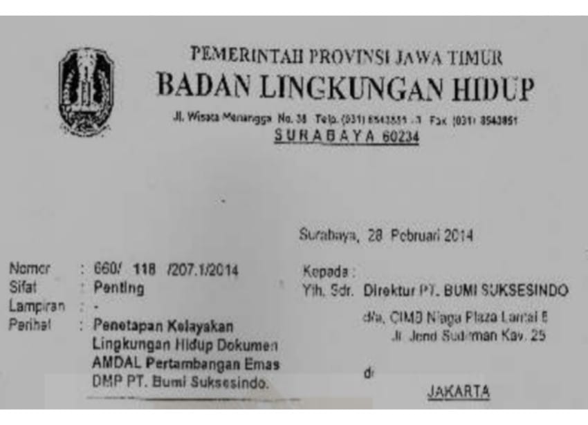 660/118/207.1/2014 Prihal Penetapan Kelayakan Lingkungan Hidup pertambangan emas DMP Bumi Suksesindo, tanggal 28 Februari 2014 yang ditandatangani Indra Wiragana, SH. selaku Kepala Badan Lingkungan Hidup Provinsi Jawa Timur, disebutkan pada huruf 3 sebagai berikut: