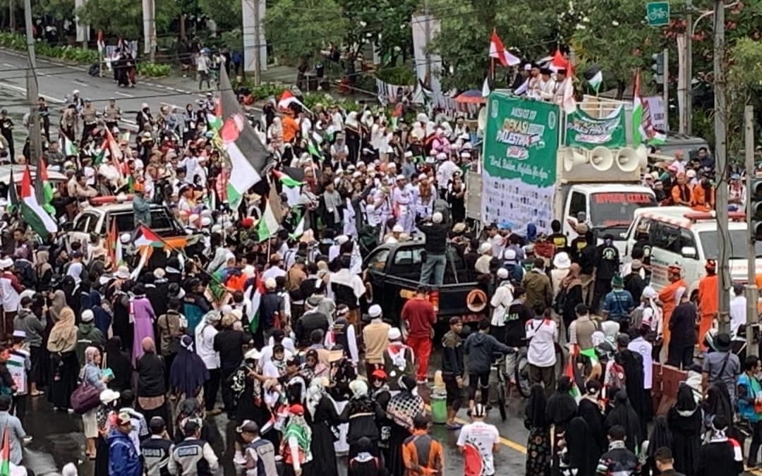 Warga tampak antusias mendengarkan para ulama dan para penggerak tokoh organisasi Islam dengan membawa bendera Palestina ribuan warga Kota Bekasi berkali – kali meneriakan bebaskan Palestina.