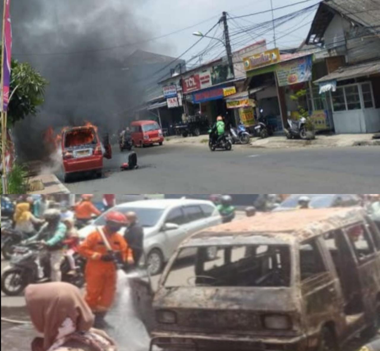 Mobil Angkot Jurusa Terminal Bekasi Ganda Agung yang sedang menunggu penumpang di jalan Agus Salim dengan kaadaan kosong tiba – tiba terbakar.
