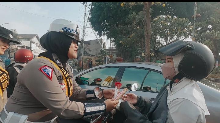 Bagi Coklat Dan Bunga Cara Polwan Polres Mojokerto ajak Masyarakat Tertib Lalu Lintas