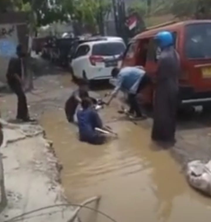 “Mulanya disitu ada lobang galian dan ada air bekas hujan, Namanya macet murun itu si motor ambil kiri terus eh tau tau ngejeblus daah… Gituh bang saya lihatnya,” Tuturnya.