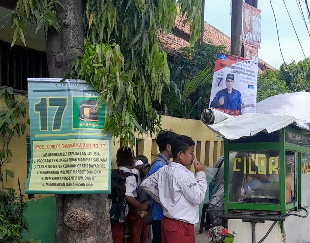 Banyaknya anak sekolah yang belum paham dan terlihat tidak etis pemasangannya. Padahal sudah ada larangan dari KPU Kota Bekasi terkait pemasangan APK di titik tertentu, namun nyatanya masih banyak yang melanggar.