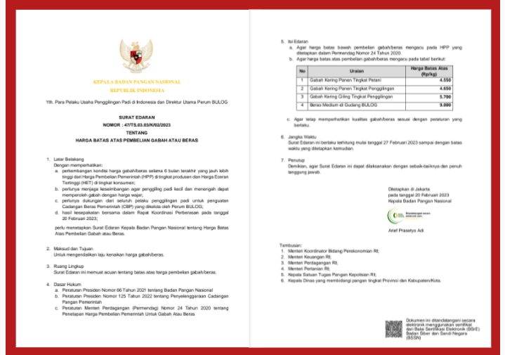 Hal tersebut tertuang dalam Surat Edaran Ketua Bapanas RI dengan nomor 47/TS.03.03/K/02/2023 tertanggal 20 Februari 2023 tentang harga batas atas pembelian gabah atau beras. Penetapan ceiling price ini mulai berlaku pada 27 Februari 2023 sampai batas waktu yang akan ditentukan kemudian.