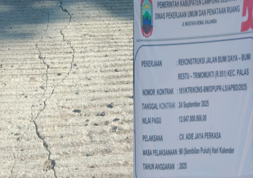Reportika.id || Lampung Selatan – Proyek Pembangunan Jalan Bumi Daya – Bumi Restu Hingga Trimo mukti Jadi Sorotan Warga Pasalnya, Cor Beton Bahu Jalan tepatnya Di Jalan Tanjakan dan Turunan Dusun Wonogiri Desa Bumi Daya Kecamatan Palas Kabupaten Lampung Selatan sudah tampak ada yang Retak-retak.