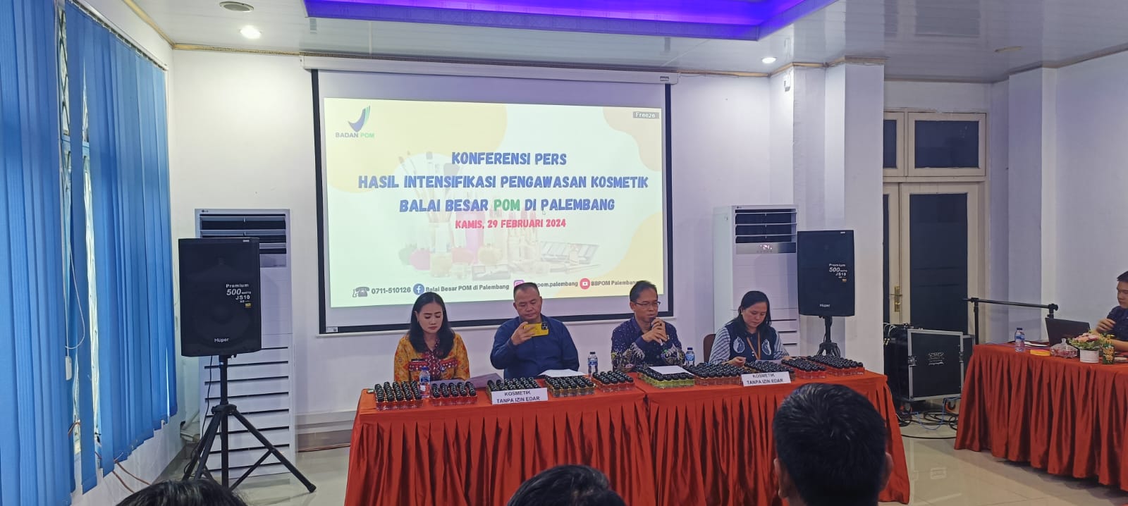 Reportika.co.id || Palembang, Sumsel – Konferensi Pers Resume Hasil Pelaksanaan Kegiatan intensifikasi Pengawasan Kosmetika BBPOM di Palembang Tahun 2024. Yang di gelar di Aula Gedung BBPOM Palembang Jalan Jakabaring, Kamis (28/2/2024).