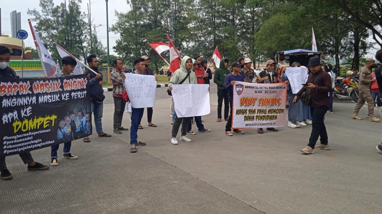 Reportika.co.id || Bekasi – Terkait adanya pemandu lagu atau lady escourt yang memakai costum seragam putih abu-abu di Kafe Infinity di Jalan MH. Thamrin Lippo, Cikarang Selatan. Didatangi Puluhan massa dari Komunitas Aktivis Muda Indonesia (KAMI), dam berunjuk rasa di depan pintu masuk gedung pemerintahan untuk bertindak tegas kepada Satpol PP Kabupaten Bekasi.