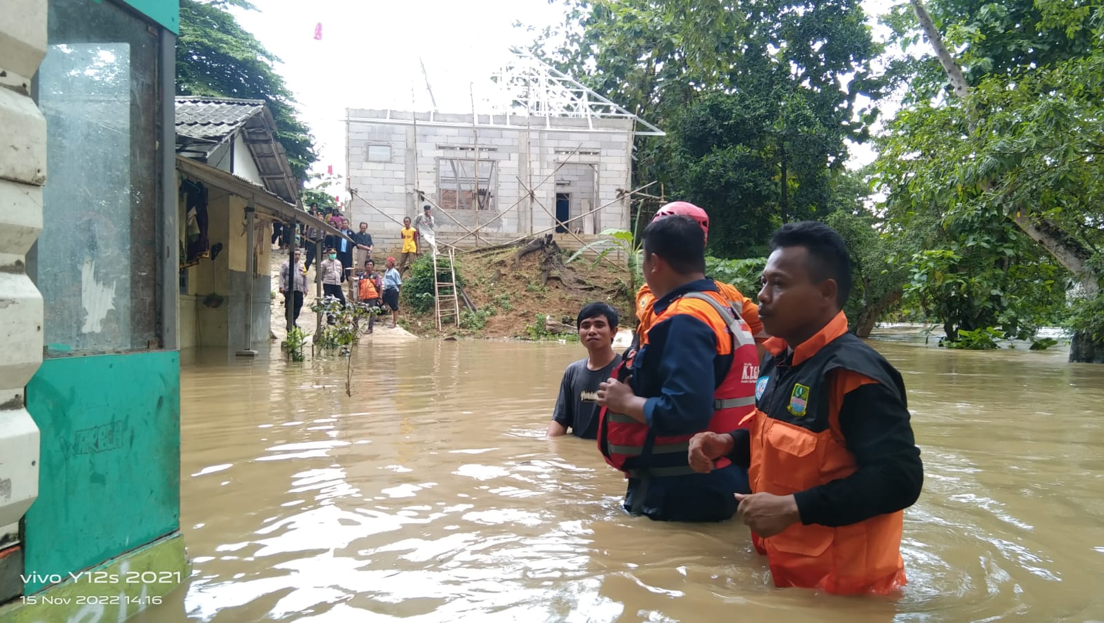 Sejumlah relawan Forum Pengurangan Resiko Bencana (FPRB) dari Kecamatan Cikarang Barat turut serta dalam proses evakuasi penanganan banjir yang terjadi di Kampung Kali Jeruk RT 002/005, Desa Kalijaya, Kecamatan Cikarang Barat Kabupaten Bekasi.(15/11/2022)