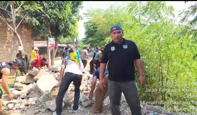 Reportika.co.id || Kabupaten Bekasi – Kepala Desa Cipayung H. Ajan beserta masyarakat laksanakan giat kerja bakti bergotong-royong memperbaiki jalan yang terkena longsor, kegiatan tersebut dilakukan agar aktifitas perekonomian masyarakat berjalan lancar.