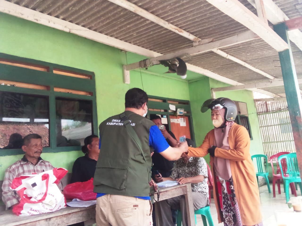 Warga antri untuk menerima bantuan sosial di halaman rumah ketua RT 010 Dusun III kampung Bolang kulon, Desa Bantarsari, Kecamatan Pebayuran, Keluarga Penerima Manfaat (KPM) di Desa Bantarsari, kembali menerima bantuan sosial dari Pemerintah Pusat. yakni, berupa Bantuan Langsung Tunai Bahan Bakar Minyak (BLT BBM) tahap 2, Bantuan Pangan Non Tunai (BPNT) dan Program Keluarga Harapan (PKH).