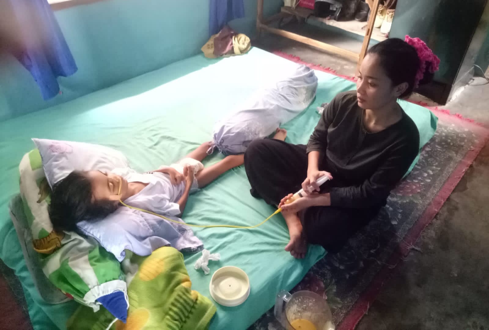 Bahkan anak dari pasangan Nurji dan Fitri ini kondisinya sangat memprihatinkan, sebab akibat penyakit yang diderita dirinya membuat tak berdaya, yang diketahui makan tidak melalui mulut pada umumnya, melainkan menggunakan alat bantu selang yang dipasang melalui hidung hingga kedalam tubuhnya.