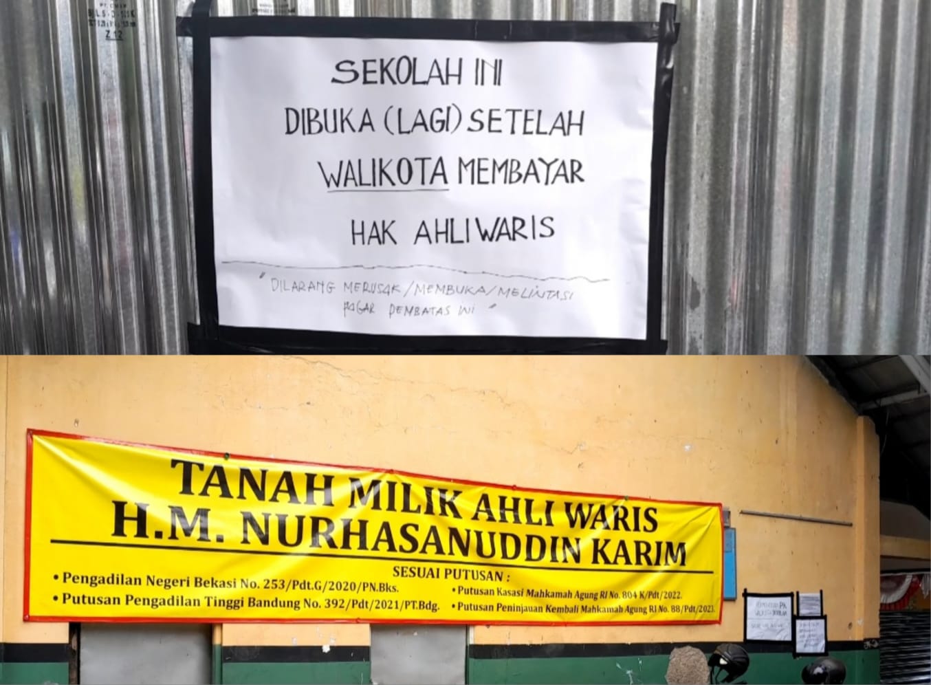 Selain itu, terdapat spanduk yang ditempel di tembok sekolah bertuliskan “Tanah Milik Ahli Waris H. M. Nurhasanuddin Karim” sesuai putusan Pengadilan Negeri Bekasi, Pengadilan Tinggi Bandung, Kasasi Mahkamah Agung RI, dan Peninjauan Kembali Mahkamah Agung RI.
