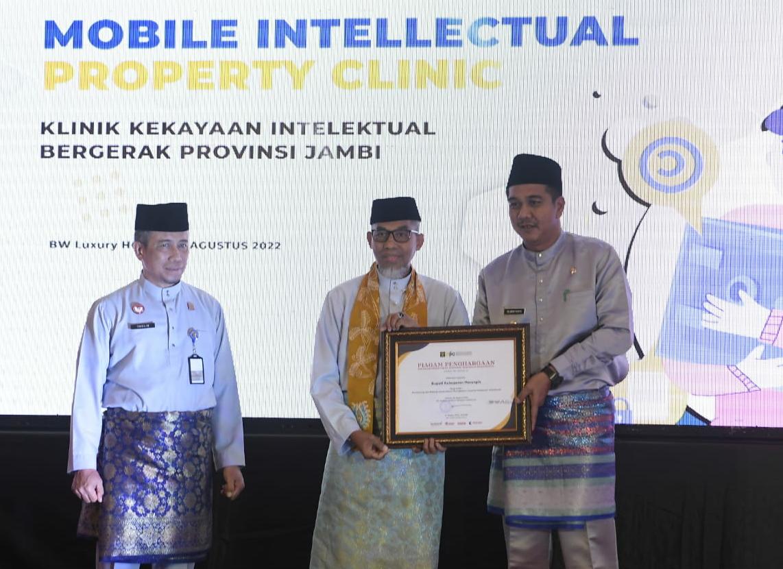 Penghargaan Kementerian Hukum dan HAM RI nomor : HKI-UM.01.02-35 itu, diterima Wabup Merangin Niwan Yahya, pada acara Pembukaan Mobile Intellectual Property Clinik di Auditorium BW Luxury Jambi, Selasa (30/8).