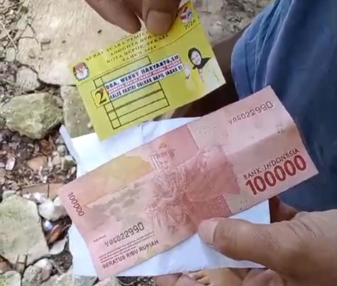 Foto dan video yang tersebar di aplikasi perpesanan siang kemarin menunjukkan amplop berisi uang pecahan Rp100 ribu, pecahan Rp50 ribu, selembaran bergambar Caleg DPR RI dari Partai Golkar Ranny Fahd A.Rafiq, dan Caleg DPRD Kota Bekasi yang juga berasal dari partai Golkar Faisal.