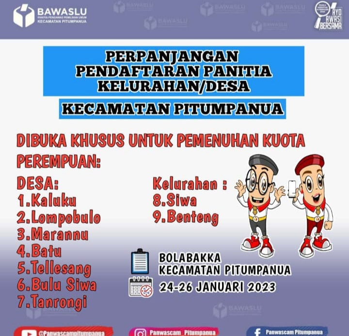 Untuk itu bagi warga dan masyarakat Kecamatan Pitumpanua yang ingin partisipasi dan memenuhi persyaratan silakkan mendaftarkan diri di Sekretariat Panwascam Pitumpanua di jalan poros Makassar- Palopo, Bolabakka ,Kelurahan Bulete antara Kantor Polsek Urban Pitumpanua dan Pertamina Siwa,”jelas Rustan.