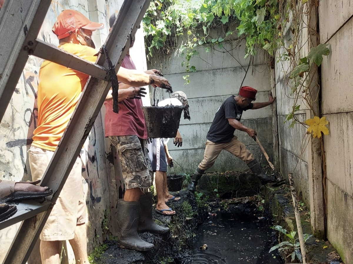 “Kami Dengan bergotong royong, bersama warga relawan FPRB Taman hati, kompak untuk turun membersihkan saluran air