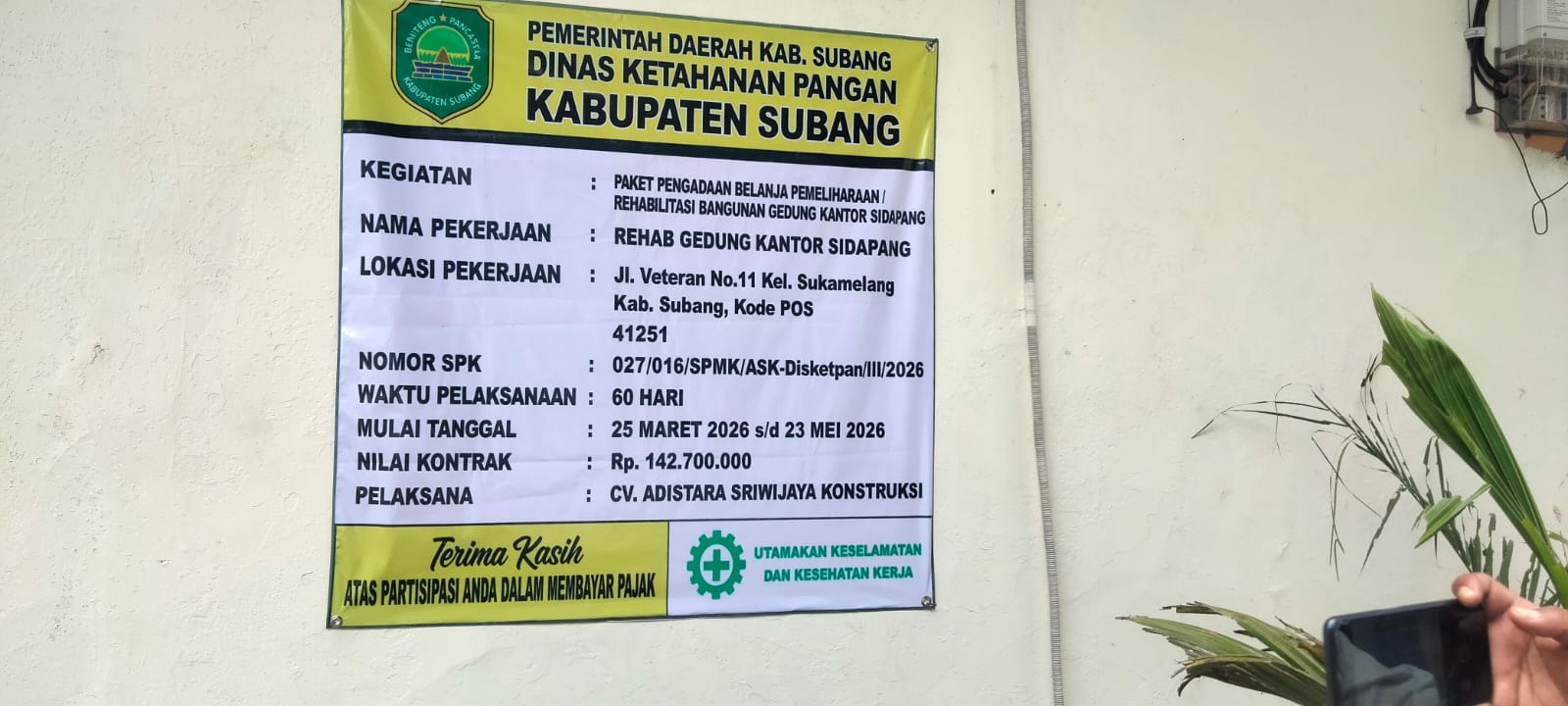 Tertera di papan informasi proyek tertulis. Kegiatan : Paket pengadaan belanja pemeliharaan/ rehabilitasi bangunan gedung kantor Sidapang. Nama pekerjaan : Rehab gedung kantor Sidapang. Lokasi pekerjaan : Jalan Veteran no. Il Kel. Sukamelang Kab. Subang, kode pos 41251. Nomor kontrak SPK : 027/016/SPMK/ASK-Disketpan/lll/2026. Waktu pelaksanaan : 60 hari mulai tanggal 25 Maret 2026 s/d 23 Mei 2026. Nilai kontrak : Rp. 142.700.000,- Pelaksana : CV. Adistara Sriwijaya Kontruksi.