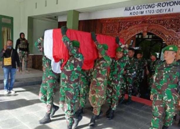 Reportika.co.id || Papua – Aparat Gabungan TNI-POLRI di Pimpin Komandan Kodim 1703/Deiyai. Letkol Inf I Wayan Dedi Suryanto SE. dalam pelaksanaan Evakuasi almarhum Letda Inf Oktovianus Sogalrey. Korban Penembakan oleh OTK di Kampung Pasir Putih. Distrik Aradide Kabupaten Paniai pada Kamis, (11/4/2024(. Sampai pengantaran di rumah Duka di jalan. Auri Kampung Girimulyo, Kabupaten. Nabire. Provinsi. Papua Tengah. Pada Jum’at, (12/04/2024).