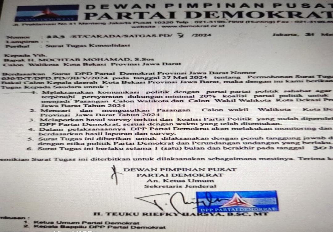 Reportika || Kota Bekasi – Bacalon Wali Kota Bekasi Jawa Barat. H Mochtar Mohamad mengapresiasi sekaligus merespon baik, surat tugas yang dikeluarkan oleh DPP Partai Demokrat yang dikeluarkan pada tanggal 31 Mei 2024 bernomor 22/ST/CAKADA/SATGAS.PD/V/2024. ditandatangani oleh ketua umum DPP Partai Demokrat. Teuku Riefky Harsya.