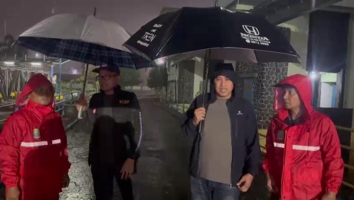 Dengan jaket hujan yang sudah setengah kuyup, ia mengamati debit air yang mulai meninggi. Wajahnya serius, sesekali berbicara dengan petugas yang berjaga.