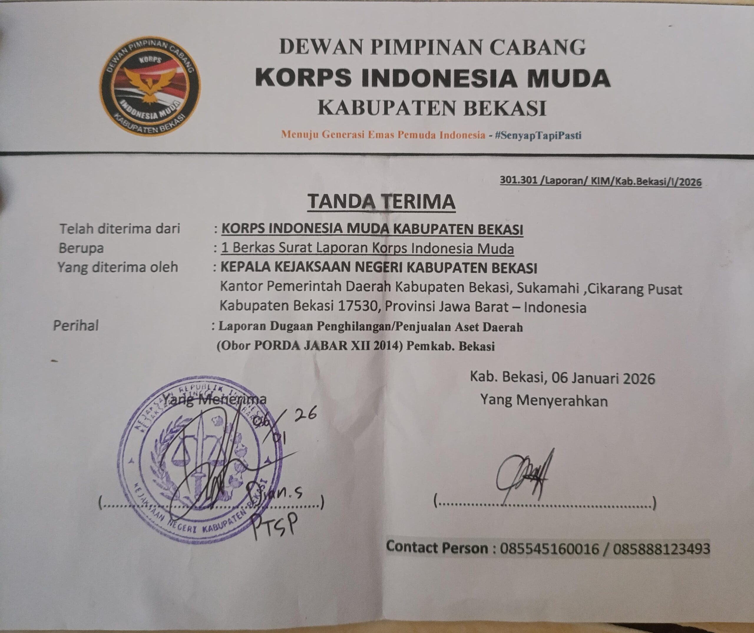 Reportika.id || Kabupaten Bekasi – Korps Indonesia Muda (KIM) Kabupaten Bekasi melayangkan surat laporan kepada Kejaksaan Negeri Kabupaten Bekasi dengan tembusan instansi terkait seperti Plt Bupati, Inspektorat, BKPSDM (Badan Kepegawaian dan Pengembangan Sumber Daya Manusia), BPKAD (Badan Pengelolaan Keuangan dan Aset Daerah) Kabupaten Bekasi.