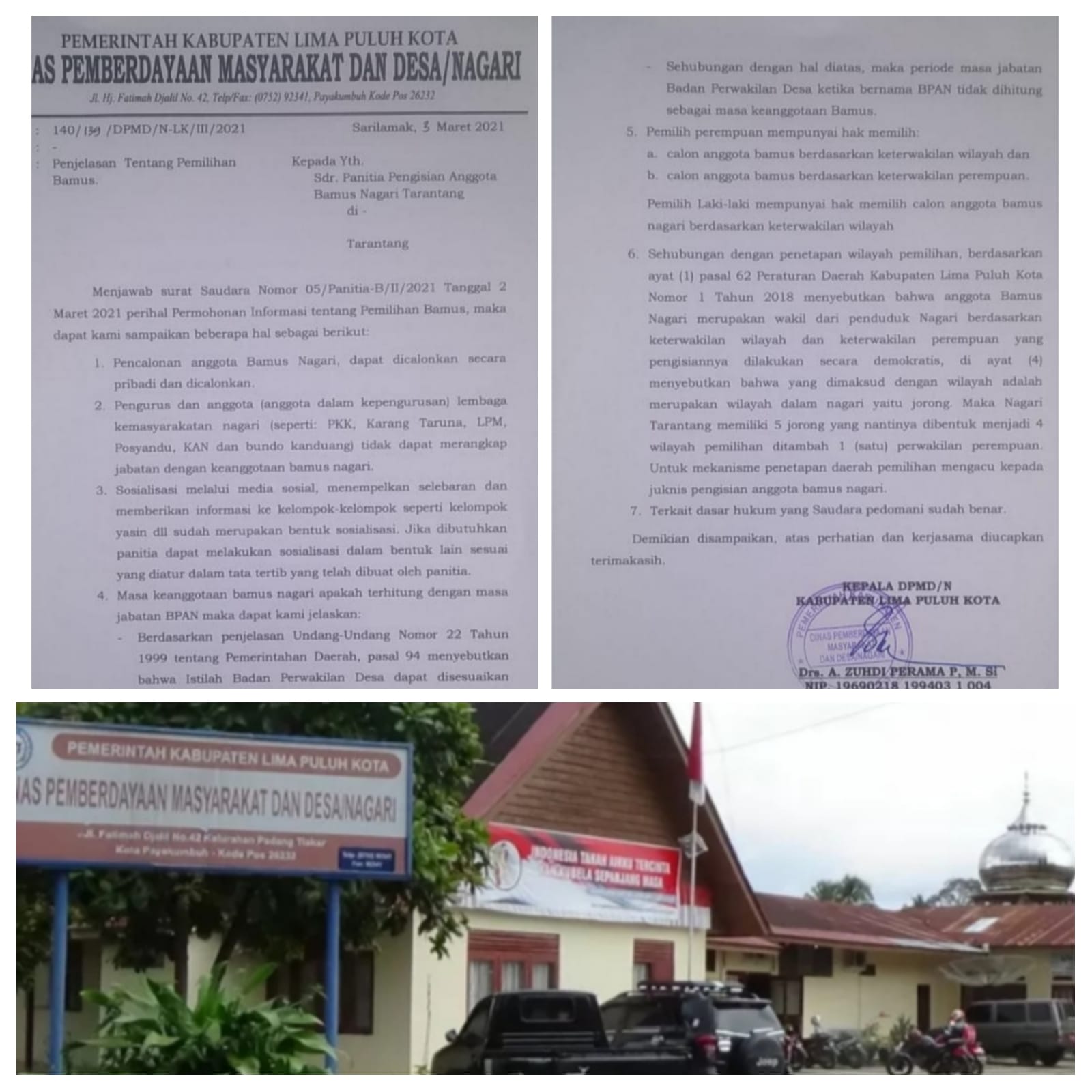 Proses Pemilihan Bamus tetap dilanjutkan sesuai hasil pemilihan tanggal 26 Maret 2021,sambil menunggu Surat balasan dari Kementrian Dalam Negeri, apapun permasalahan pemilihan anggota Bamus Nagari akan ditindak lanjuti sesuai ketentuan dan berlaku untuk Kabupaten Limapuluh Kota, adapun balasan tersebut berdasarkan Surat yang dikirim DPMD/N ke Kemendagri pada tanggal 29 Maret 2021.