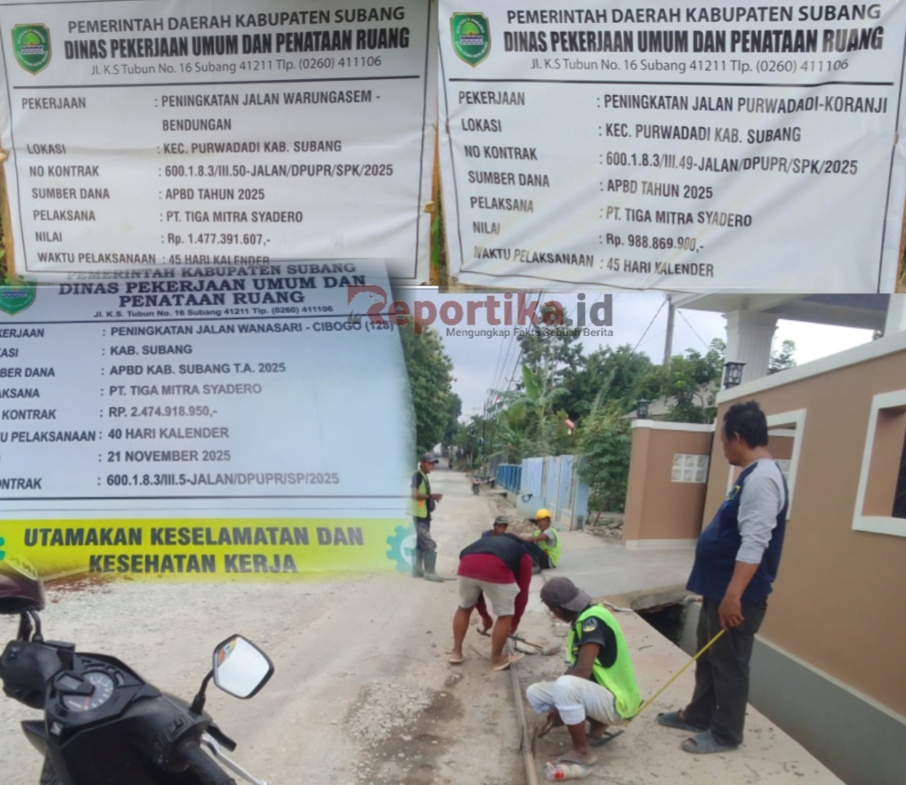 - Pekerjaan : Peningkatan jalan Purwadadi- Koranji, lokasi Kec. Purwadadi Kab. Subang, No. Kontrak 600.1.8.3/lll.49-JALAN/DPUPR/SPK/2025, sumber dana APBD tahun 2025, pelaksana PT. Tiga Mitra Syadero, nilai Rp. 988.869.900.