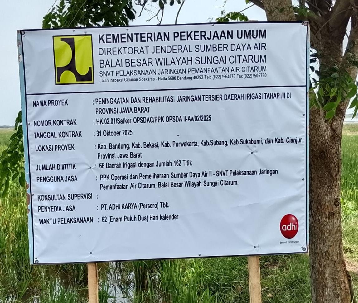 Reportika.id || Subang, Jabar- Sebuah Proyek Balai Besar Wilayah Sungai (BBWS) Citarum Tahun Anggaran 2025 dengan judul peningkatan dan rehabilitasi jaringan tersier daerah irigasi tahap III di Provinsi Jawa Barat yang dikerjakan oleh PT. Adhi Karya (Persero) Tbk.
