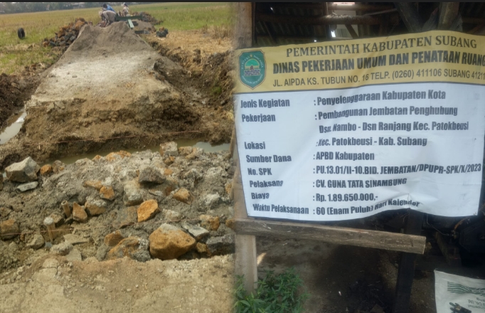 Reportika.co.id || Subang, Jabar – Awak media Senin 13 November 2023, mendatangi proyek pembangunan jembatan penghubung Dusun Nambo- Dusun Ranjeng di Desa Ranca Asih Kecamatan Patokbeusi Kabupaten Subang-Jabar, sumber dana APBD Kabupaten, Nomor SPK: PU.13.01/11/-10 BID. JEMBATAN/DPUPR-SPK/X/2023, pelaksana : CV. Guna Tata Sinambung, Biaya : Rp. 1.89.650.000,-, waktu pelaksanaan : 60 hari kalender.