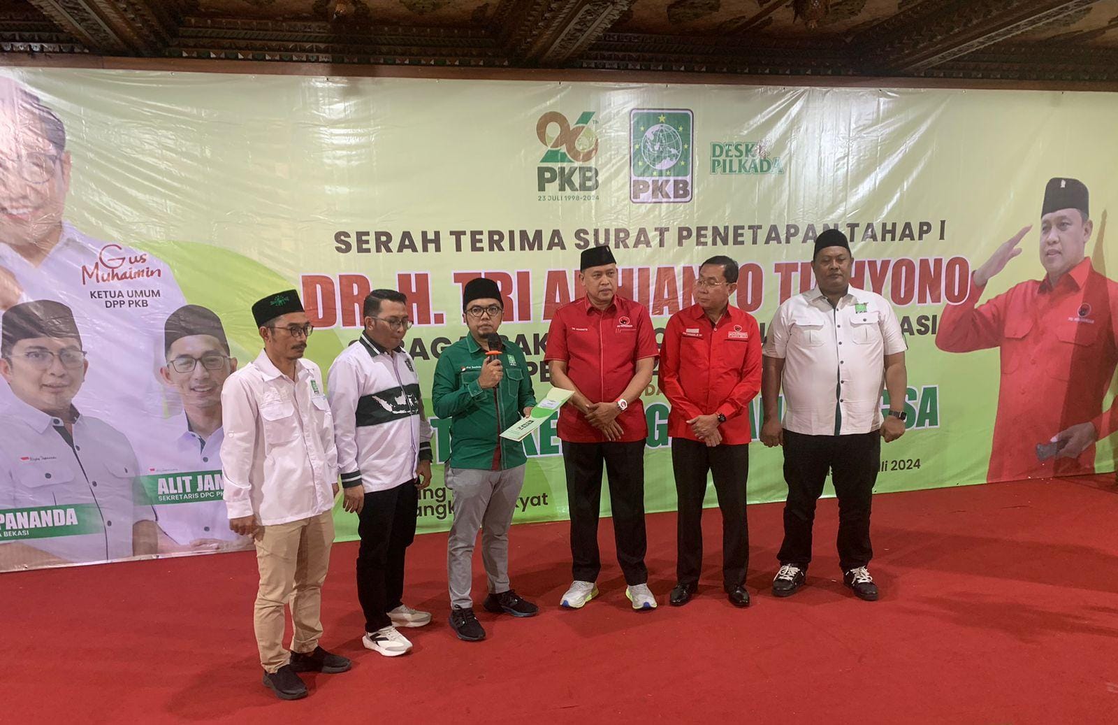 Reportika.co.id || Kota Bekasi – DPC PKB Kota Bekasi secara resmi mendukung dan menyerahkan surat penetapan kepada Tri Adhianto sebagai Bakal Calon Wali Kota Bekasi periode 2024-2029, Jum’at (26/7/2024).