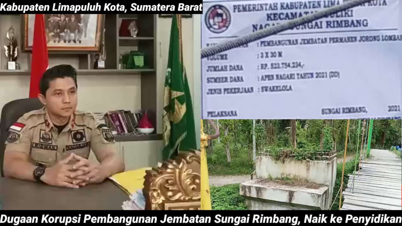 “Secara umum setelah melakukan hampir sebulan penyelidikan, kami masih memperkuat bukti bukti yang sudah kami kantongi untuk menentukan siapa terduga yang bertanggung jawab atas dugaan kerugian keuangan negara pada pembangunan Jembatan Jorong Lombah, Nagari Sungai Rimbang yang menggunakan Dana Desa (DD) TA 2021,” tambah Kepala Kacabjari Suliki, Ridwan, SH.