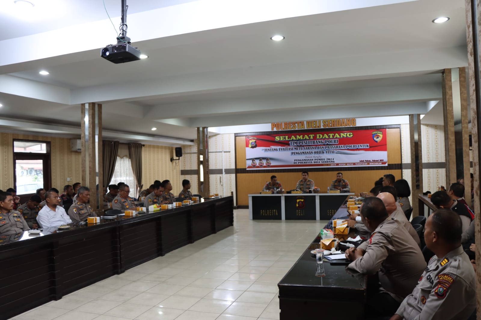 Reportika.co.id || Deli Serdang, Sumut – Bertempat di Aula Tribrata Polresta Deli Serdang, Kepolisian Resor Kota Deli Serdang menerima kunjungan dari Tim Pusat Penelitian dan Pengembangan (Puslitbang) Polri dalam rangka Evaluasi Mutu Sarana dan Prasarana Polri untuk Pengamanan Objek Vital dalam rangka Pengamanan Pemilu 2024.