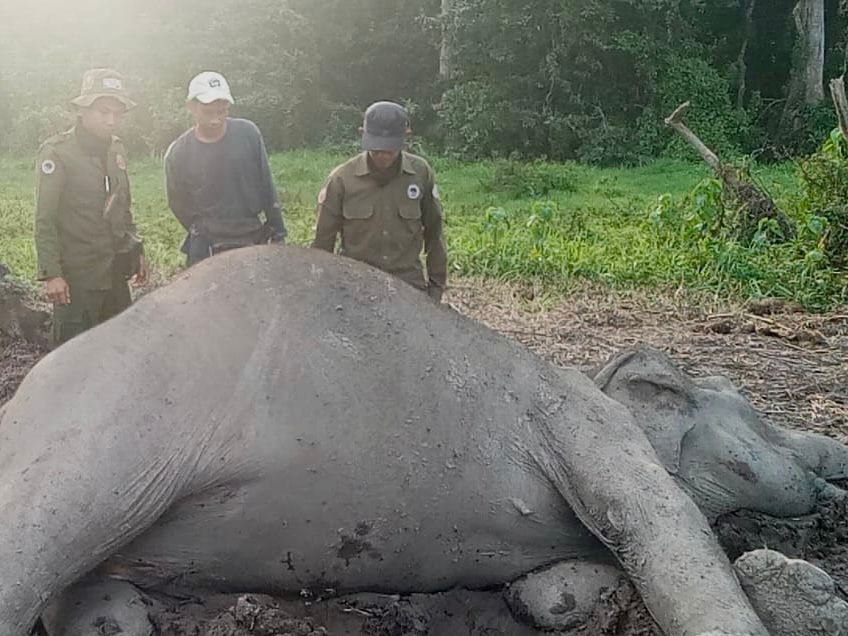 Gajah tersebut ditemukan dalam posisi menyamping ke kiri, dan petugas saat ini masih menyelidiki penyebab kematiannya.