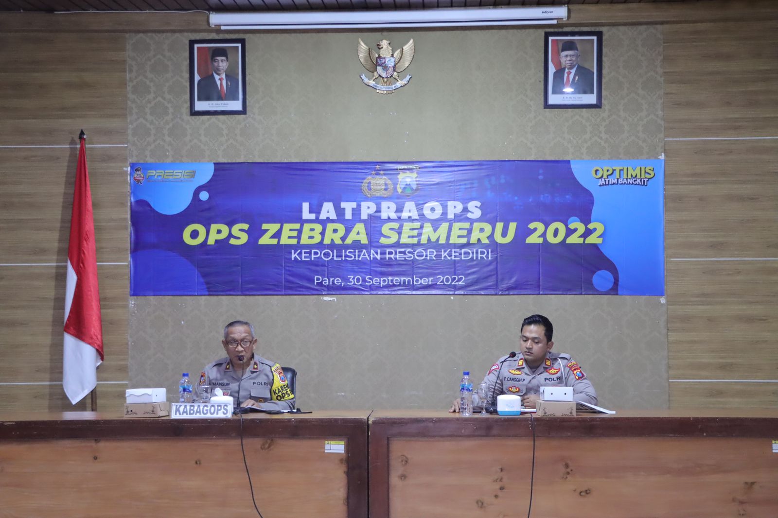Reportika.co.id || Kediri, Jatim – Menjelang pelaksanaan Operasi Zebra Semeru 2022 yang akang h dilaksanakan serentak di seluruh Indonesia selama 14 hari mulai tanggal 03 Oktober sampai dengan 16 Oktober, Polres Kediri menggelar Latpraops di Aula Jana Nuraga Mapolres Kediri, Jum’at (30/9/22).
