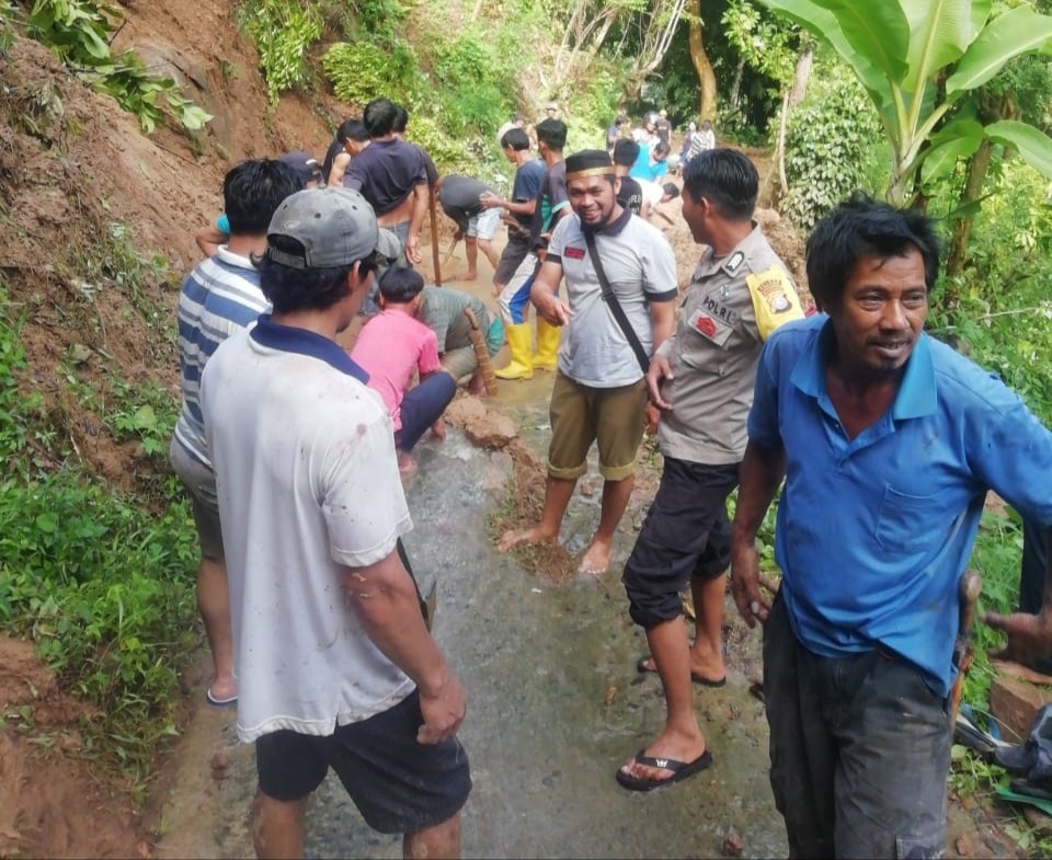 Dalam kesempatan ini bhabinkamtibmas Bripka Sarto P dan warga desa bergotong royong membuka kembali akses jalan yg terdampar bencana longsor
