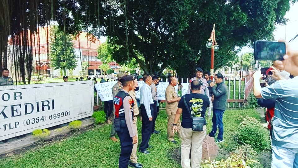 Reportika.co.id || Kediri, Jawa Timur – Puluhan massa yang tergabung dalam AKSi (Anti Korupsi Indonesia) menggelar aksi damai di depan Kantor Pemerintah Kabupaten Kediri, Senin (20/2/2023). Mereka menuntut agar Camat Pagu yang diduga telah melakukan Kekerasan Dalam Rumah Tangga (KDRT) dicopot dari jabatannya.
