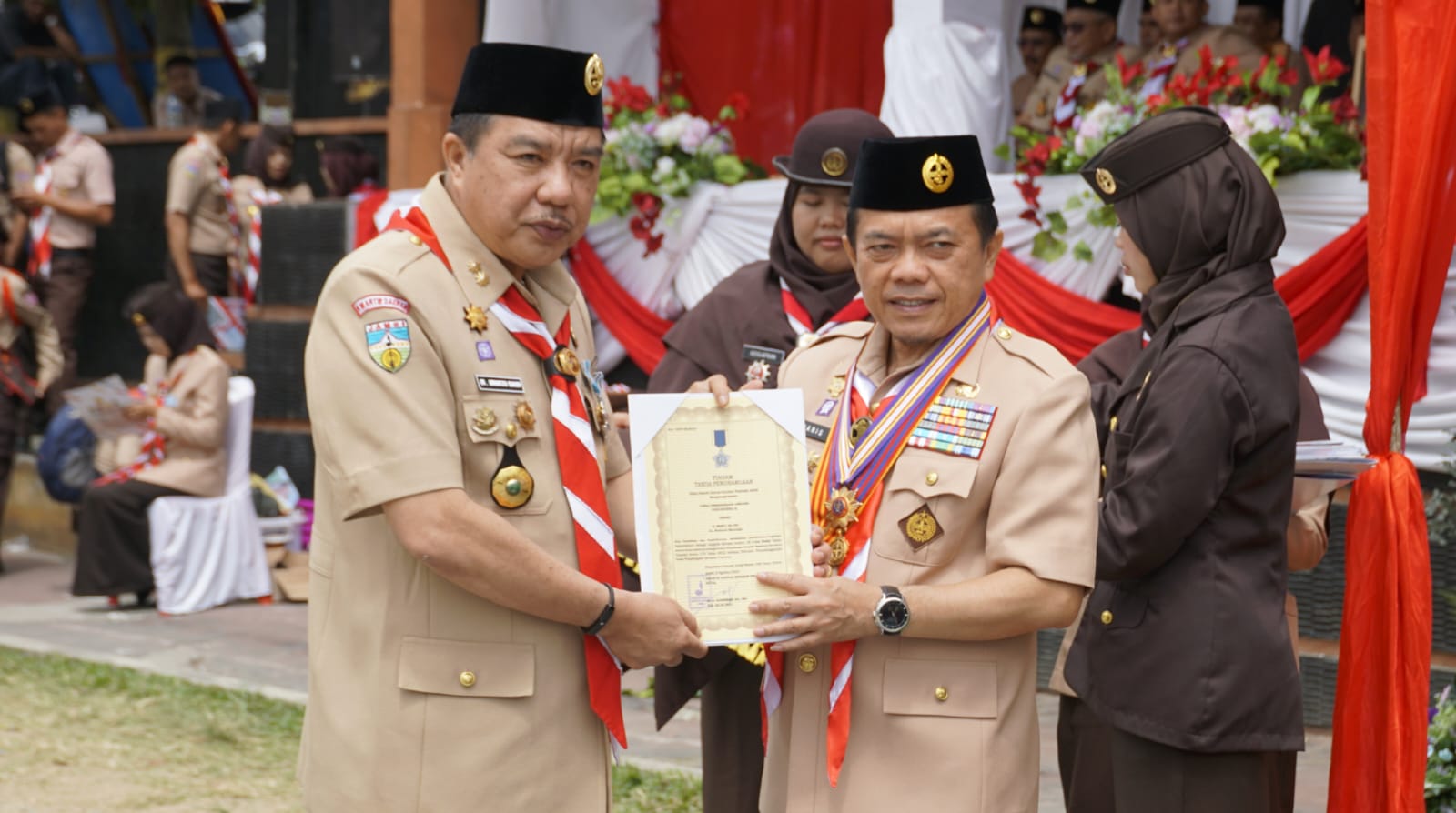 Tanda penghargaan bergensi tersebut, diserahkan Gubernur Jambi H Al Haris selaku Katua Mabida Gerakan Pramuka Provinsi Jambi, dihadapan ribuan pengurus dan anggota Kwartir Gerakan Pramuka dari kabupaten/kota se-Provinsi Jambi.