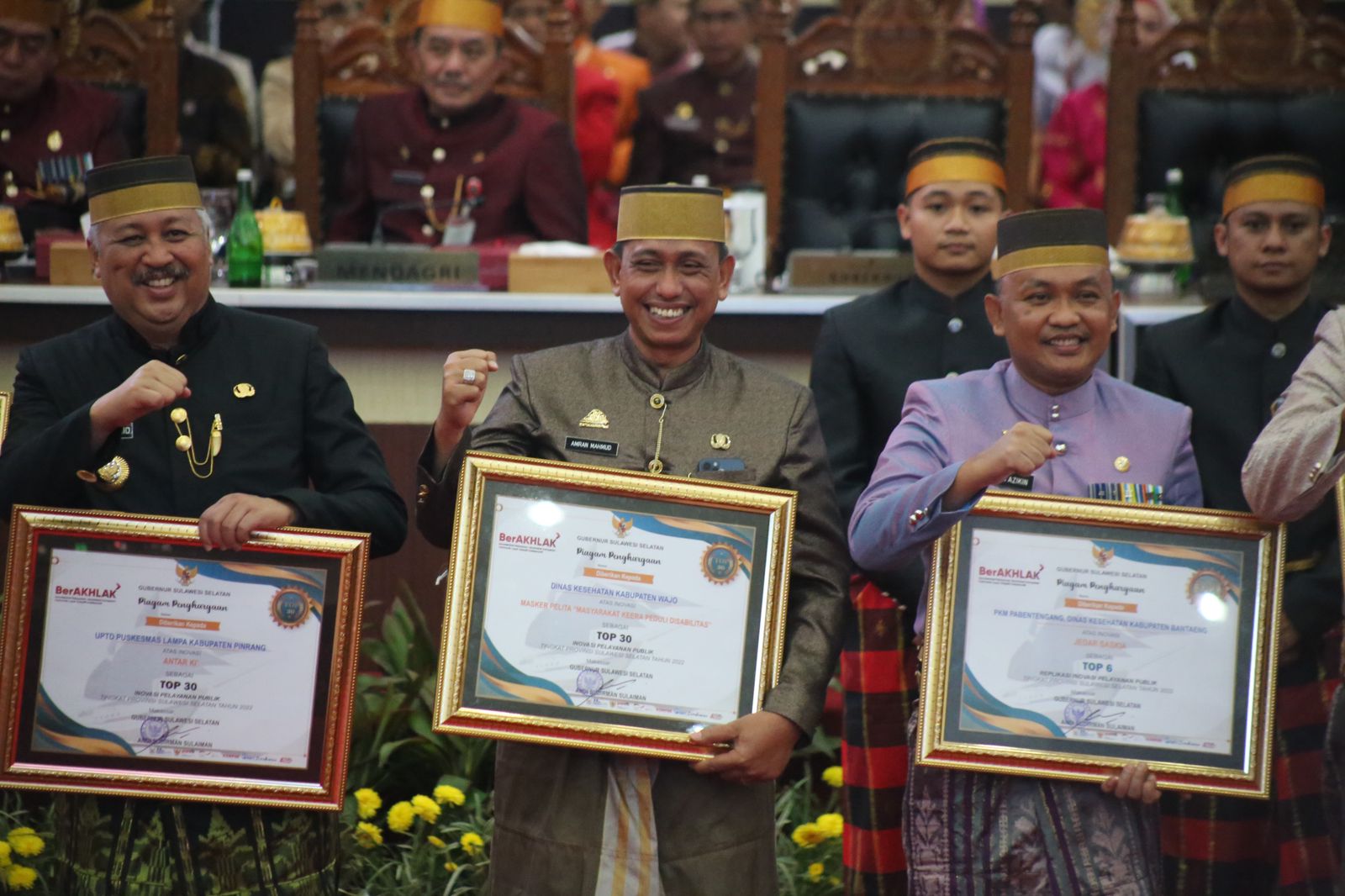 Pada kesempatan ini, Bupati Wajo bersama 16 bupati/wali kota atau mewakili, menerima piagam penghargaan dari Gubernur Sulsel sebagai Top 30 Inovasi Pelayanan Publik Tingkat Sulsel 2022. Inovasi Wajo, yaitu Masker Pelita (Masyarakat Keera Peduli Disabilitas) dari Dinas Kesehatan dengan inovator Kepala UPTD Puskesmas Keera, Ruslan.