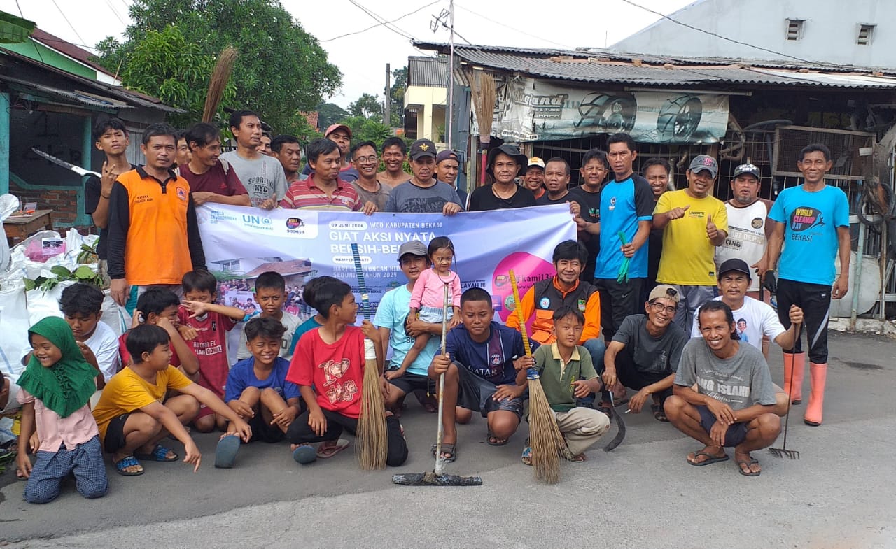 Reportika.co.id || Kabupaten Bekasi – Memperingati hari lingkungan hidup sedunia yang jatuh pada tanggal 5 Juni 2024 warga bersama dengan komunitas dan relawan lingkungan hidup melaksanakan aksi gotong royong bersih bersih lingkungan yang di titik pusatkan di RT 007 /RW 01 Telaga Asih, CiKarang Barat Kabupaten Bekasi