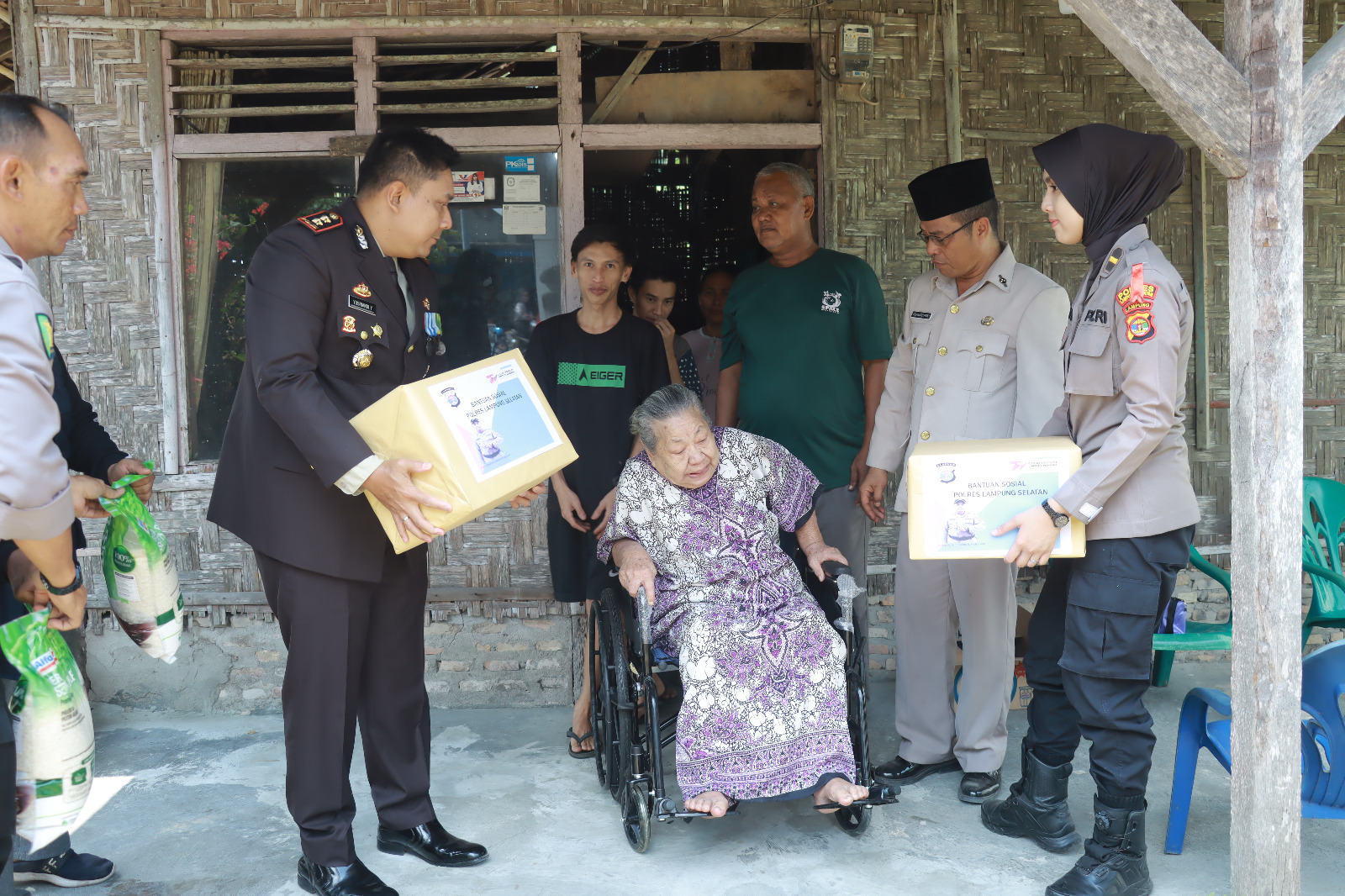 Bantuan satu unit kursi roda dan sembako di berikan langsung oleh Kapolres Lampung Selatan AKBP Yusriandi Yusrin saat silaturahmi di sebuah gubuk geribik nenek Kurniati atau yang lebih dikenal dengan ci kukun.