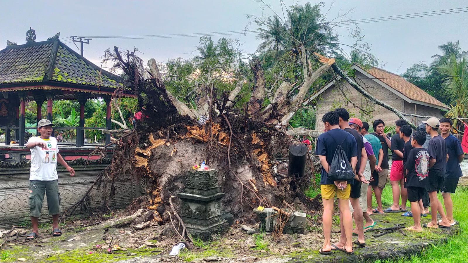 Ketut Grane selaku Ketua Adat saat dikompirmasi mengatakan kejadian angin kencang ini sekitar pukul 16; 20 wib, karna angin yang begitu kencang jadi pohon yang sudah tua tidak kuat menahannya mengakibatkan pohon bringin roboh.
