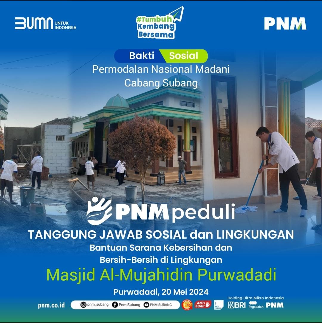 Acara tersebut di laksanakan pada hari Senin 20 Mei 2024, bertempat di Masjid Al-Mujahdin Purwadadi, kegiatan tersebut melibatkan seluruh karyawan PNM yang dengan semangat gotong royong. Kegiatan bersih-bersih tersebut meliputi pembersihan lantai, dinding, karpet, dan area sekitar mesjid untuk menciptakan lingkungan yang nyaman dan bersih bagi para jemaah.