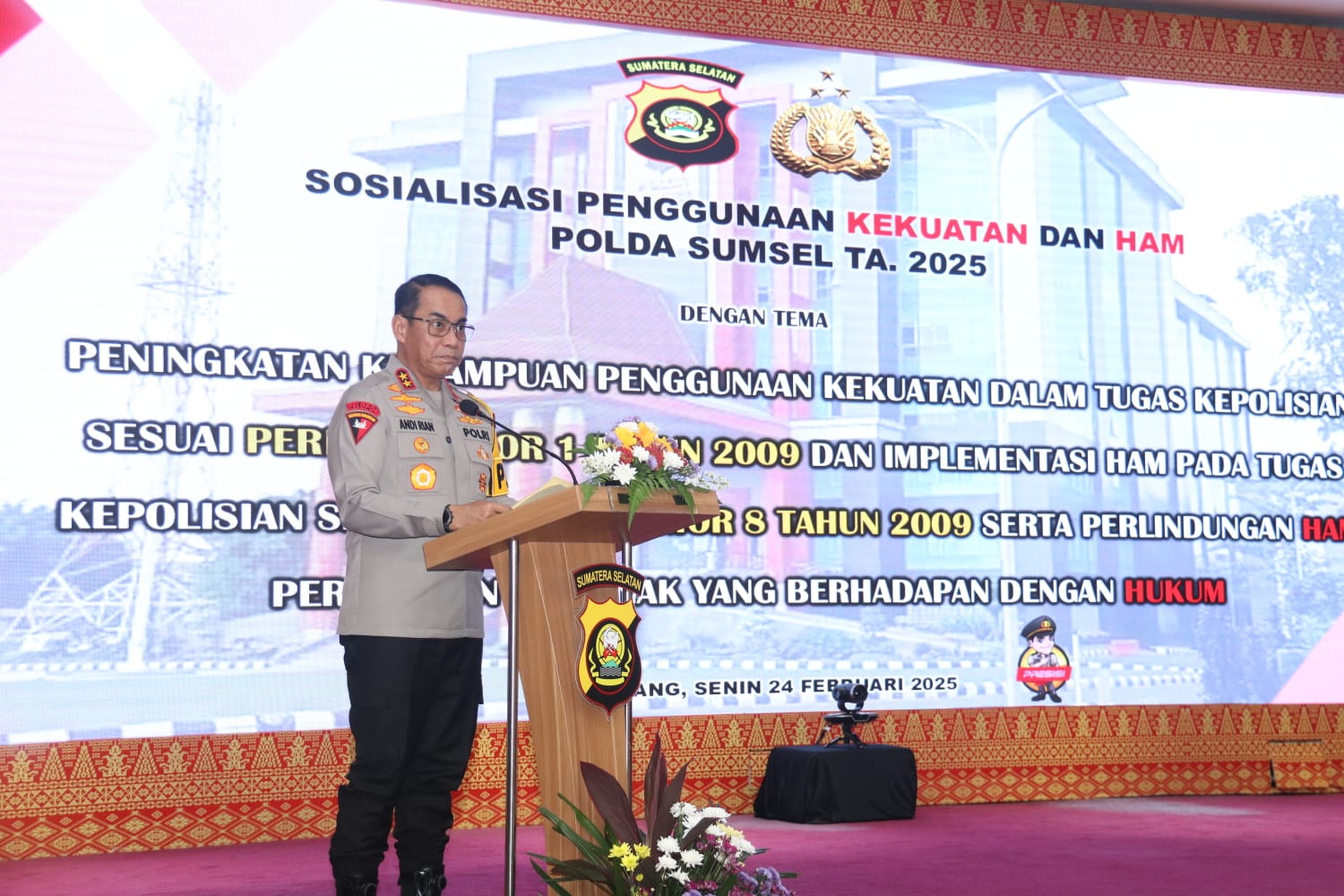 Reportika|| Palembang – Polda Sumsel menggelar Sosialisasi Penggunaan Kekuatan dan Ham Polda Sumsel Tahun 2025 untuk Peningkatan Kemampuan Penggunaan Kekuatan dalam tugas Kepolisian Sesuai Perkap Nomor 1 Tahun 2009 dan Implementasi HAM Pada Tugas Kepolisian Sesuai Tugas Perkap Nomor 8 Tahun 2009 Serta Pelindungan HAM, Perempuan dan Anak berhadapan dengan Hukum.