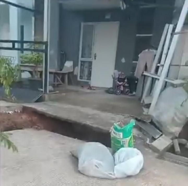Tanah di sisi rumah mengalami amblas cukup parah, bahkan berdampak pada jalan lingkungan yang retak dan terputus.Kondisi tersebut dinilai sangat membahayakan keselamatan penghuni, terutama saat hujan turun dengan intensitas tinggi.