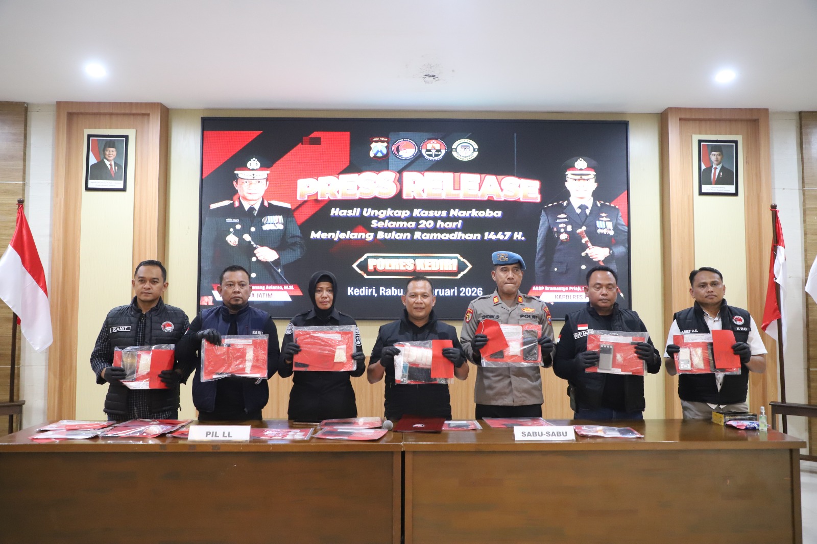 Hasil pengungkapan tersebut disampaikan Kapolres Kediri AKBP Bramastyo Priaji, S.H., S.I.K., M.Si. melalui Kasatresnarkoba Polres Kediri AKP Sujarno, S.H., M.H. dalam konferensi pers yang digelar di Aula Wicaksana Laghawa Mapolres Kediri, Rabu (18/2/2026).