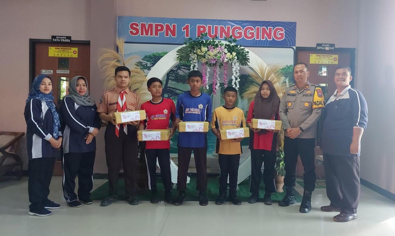 Kapolsek Pungging Iptu Selimat, SH., MH., bersama dengan anggotanya melaksanakan kegiatan santunan terhadap Siswa Yatim Piatu bertempat Di Sekolahan SMPN 1 Pungging,Pada Hari Jum’at 23 Agustus 2024.