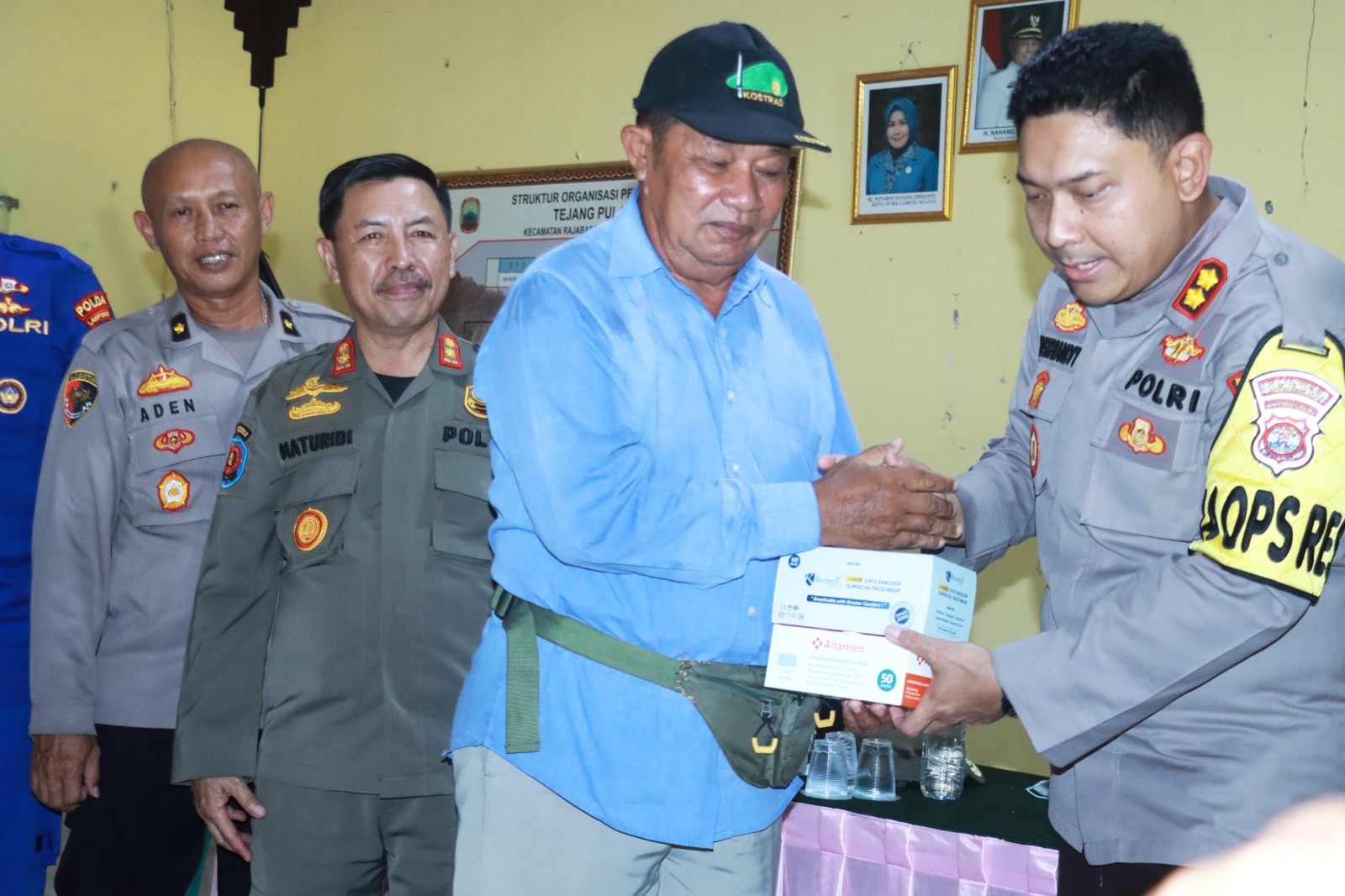 Kapolres Lampung Selatan AKBP Yusriandi Yusrin menyampaikan maksud kedatangannya di Pulau Sebesi ini untuk bersilaturahmi dengan warga, memberikan bantuan masker, kacamata faceshield dan memberikan pelayanan kesehatan.