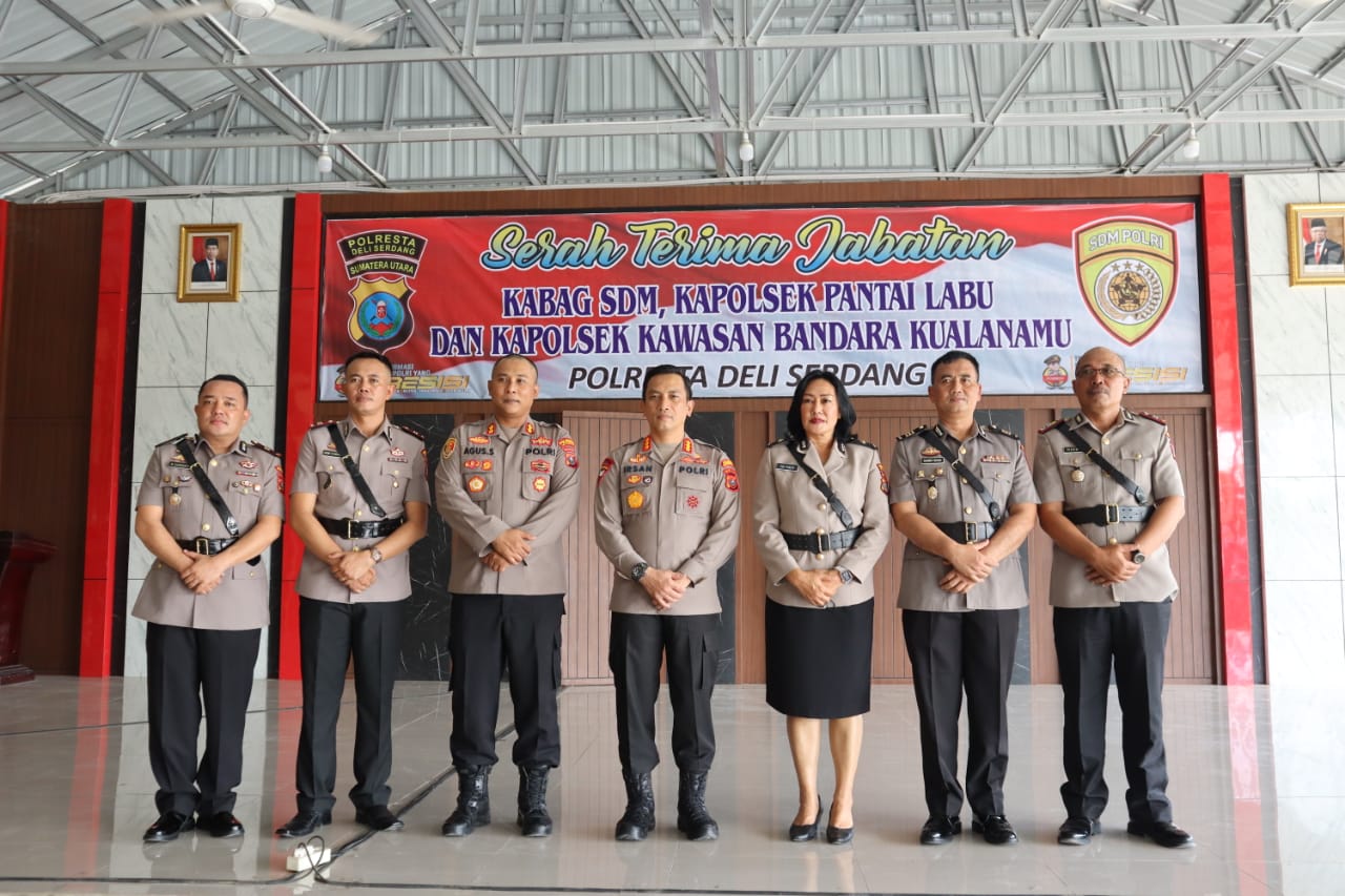 Adapun pejabat yang melaksanakan sertijab yakni AKP Slamet Riyadi, SH, MH menerima tugas dan tanggung jawab baru sebagai Kabag SDM Polresta Deli Serdang yang sebelumnya dijabat oleh Kompol Dr. Serimin Pinem, SH, M.Kn, dan selanjutnya Kapolsek Kawasan Bandara KNIA Polresta Deli Serdang dari Iptu Jonni H. Damanik, SH, MH kepada Iptu Natanail Surbakti, SH. serta Kapolsek Pantai Labu Polresta Deli Serdang dari Iptu Sopar Sitorus kepada Iptu Marwan.