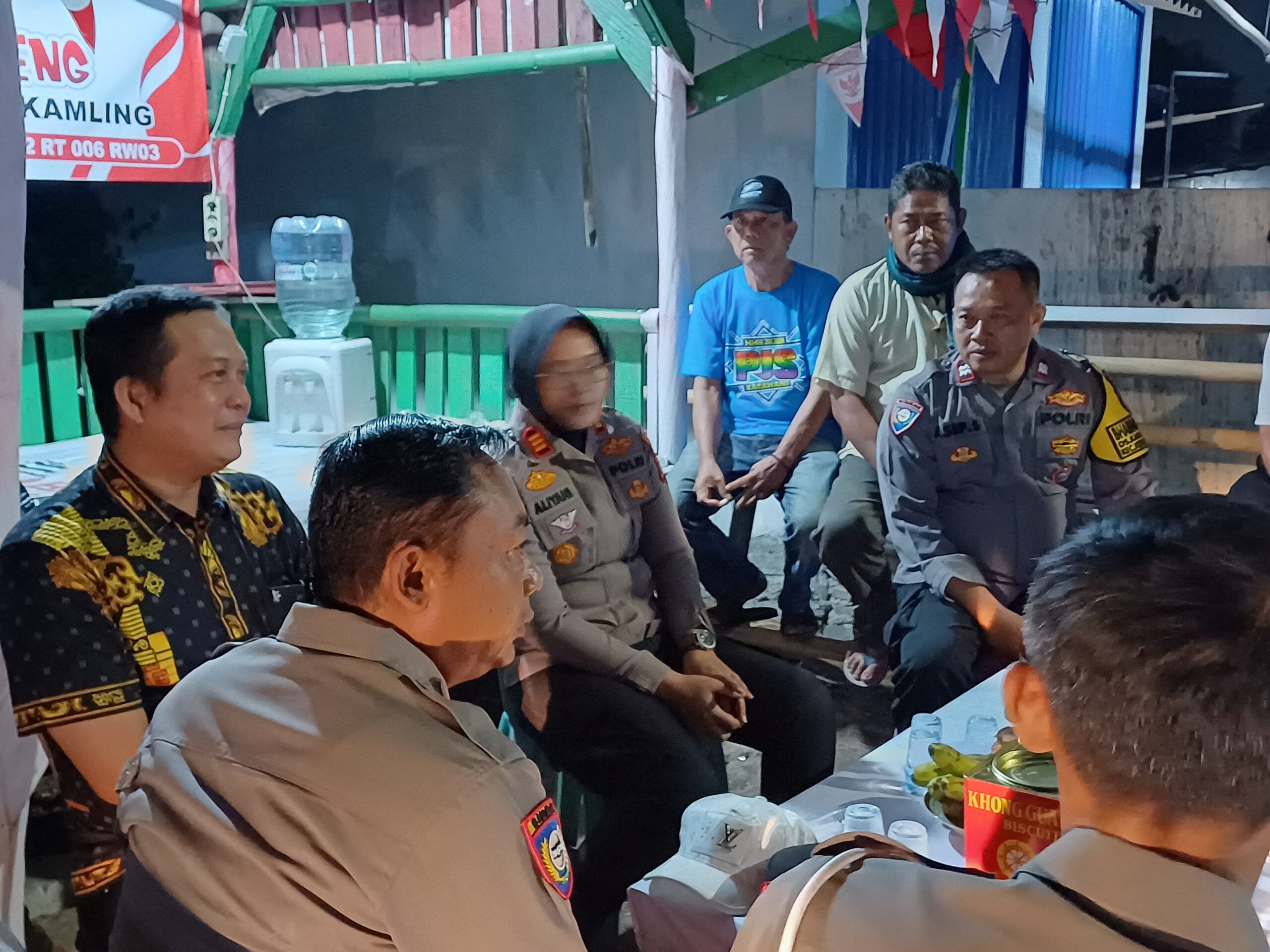 Kapolsek Kedung Waringin Polres Metro Bekasi AKP ALIYANI Sh di dampingi oleh Kanit Intelkam, Kanit Binmas, Kanit Satlantas, Propam, BhabinKamtibmas desa karang harum, Serta personil lainnya Langsung memperkenalkan diri kepada warga dan berdiskusi dg Kepala desa, Tokoh masyarakat dan Warga desa karang harum dalam kegiatan Ngopi Kamtibmas pada sabtu malam, 24 Agustus 2024